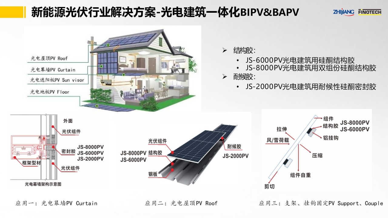 之江公司依托密封膠領域多年的創新平臺,推出了優異的光伏行業用膠解決方案以及光電建筑一體化解決方案,開發出了性能優異的JS-6000PV/JS-8000PV光電建筑用結構膠、JS-2000PV光電建筑用耐候膠等有機硅系列品種,應用于光電建筑幕墻、光電屋頂、組件掛鉤粘接等方面。